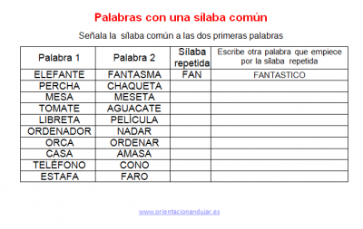 Dentro de las actividades que desde orientación Andújar estamos preparando para trabajar con alumnos que presentan problemas en la lectoescritura, dislexia. Os proponemos hoy unas actividades en las que nuestros alumnos deben de encontrar sílabas comunes dentro de la las palabras.